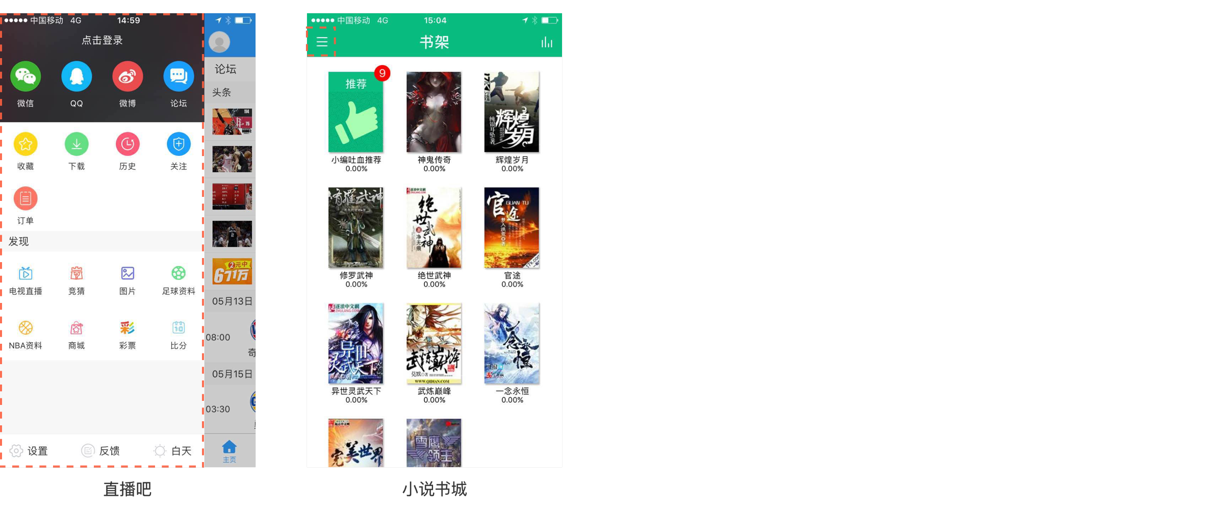 7.2當我們設計的信息術語是 沉浸式信息時(如新聞類頁面、閱讀類頁面),用戶會花80%時間沉浸在界面中,20%的時間用來做其他事情,它們慣用的操作一直是“下拉、刷新”,很少跳轉(zhuǎn)。一些使用率較低的功能就需要設計師幫用戶“隱藏起來”。如下圖所示:直播吧、小說書城。
