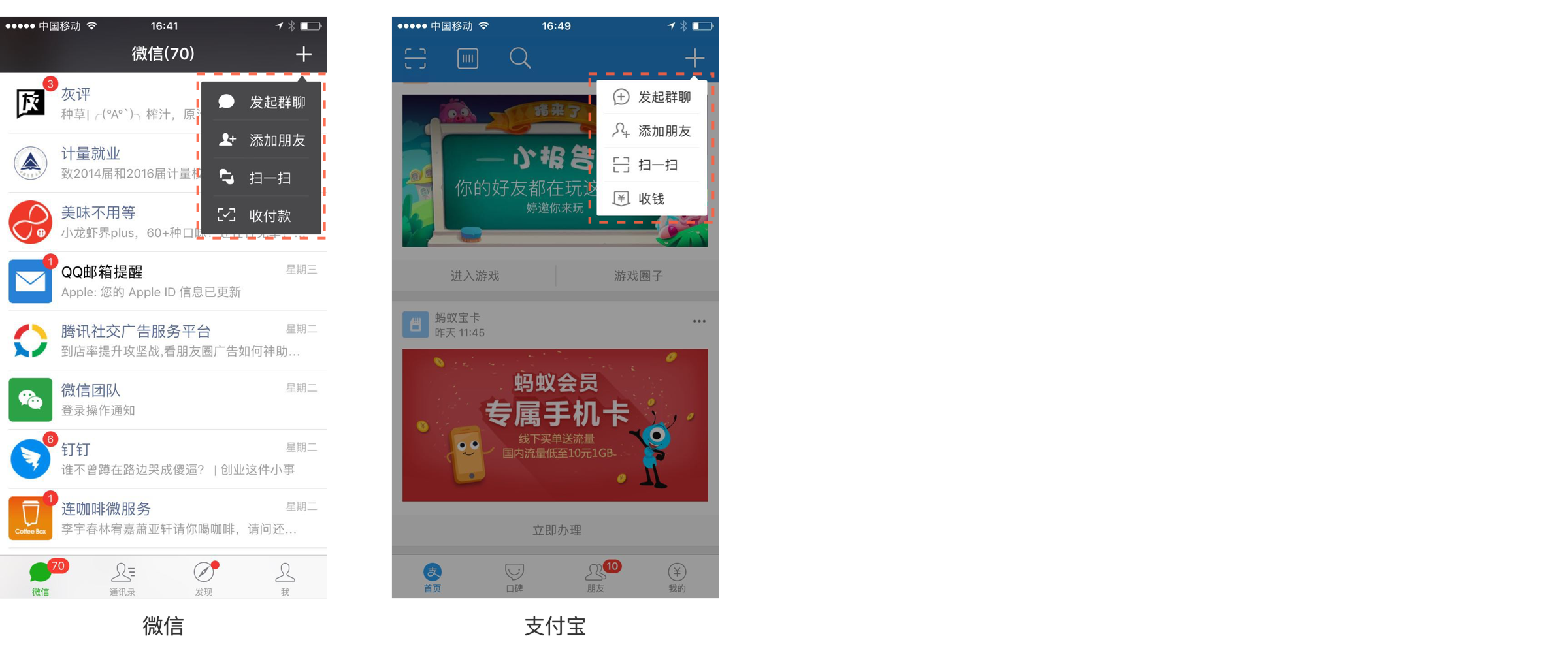 8.1如下圖所示的微信、支付寶,下拉菜單用于快速啟動某些常用的功能模塊。點擊界面其他區(qū)域即可隱藏菜單。