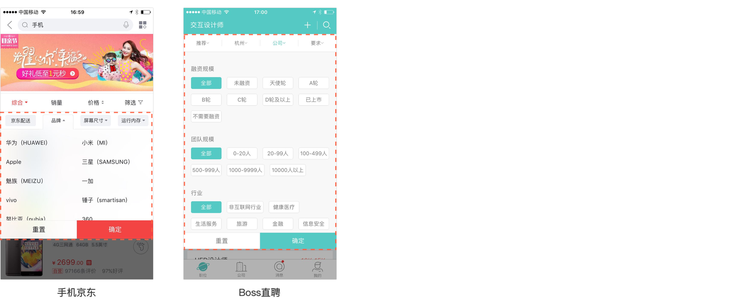 8.2如下圖所示的手機京東、Boss直聘,下拉菜單用于信息列表的篩選,用于篩選同一信息列表下不同類別的信息。需要注意的是,不要讓菜單覆蓋整個屏幕,并且點擊背景的任意區(qū)域都可以隱藏菜單。