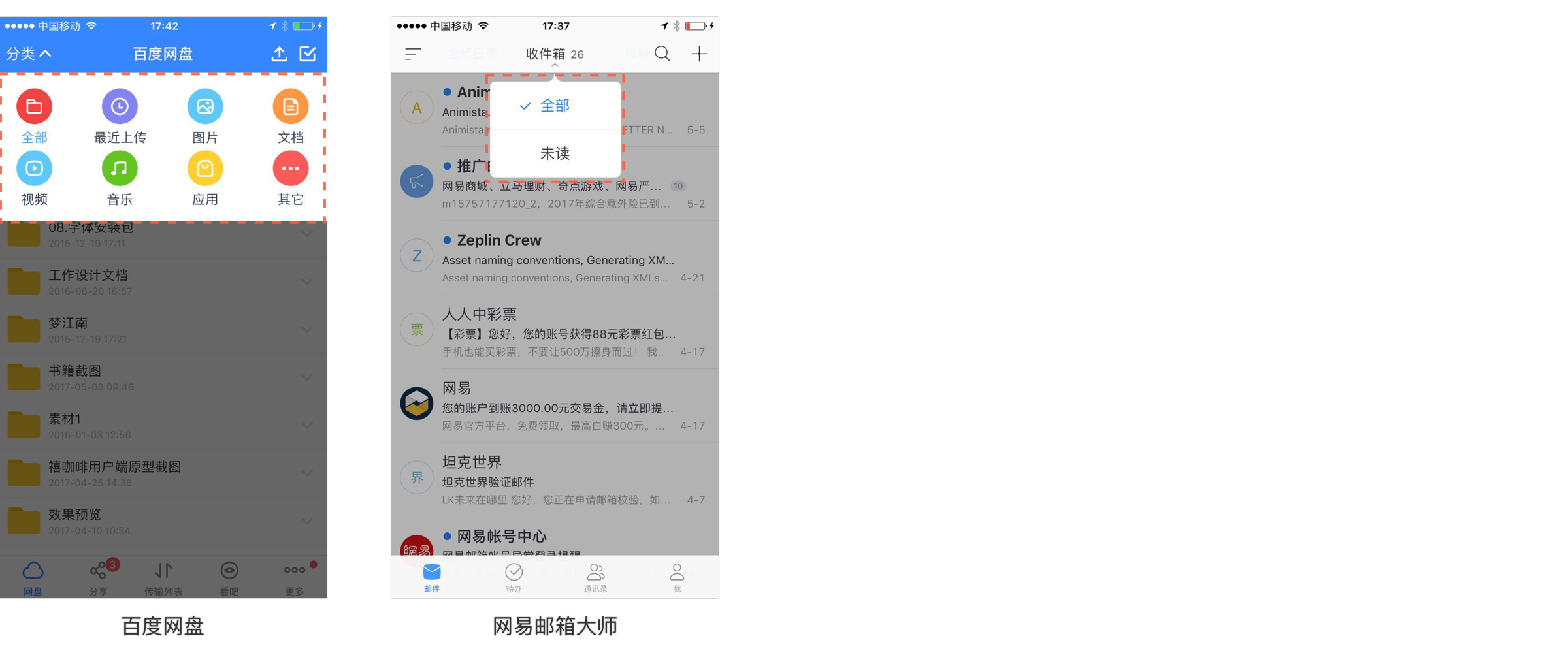 8.3如下圖所示的百度網(wǎng)盤、網(wǎng)易郵箱大師,對同一個類別下的不同視圖間進行導航,而不是跳轉(zhuǎn)到完全不同的類別,原生的Spinner控件的運用比較少了,現(xiàn)在國內(nèi)的應用都做了差異化的運用(話說回來,在能實現(xiàn)目標的情況下,設計本不因拘泥于規(guī)范)。