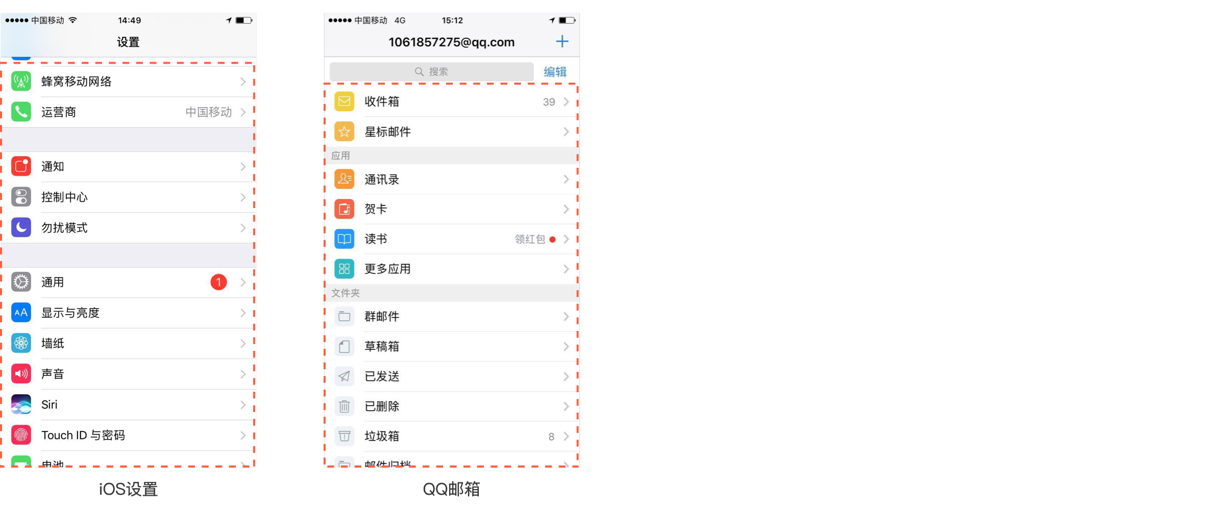 1.1列表式導航作為主導航,必須滿足層級淺且內(nèi)容平級的條件。如下圖所示,iOS中的設置、QQ郵箱是為數(shù)不多的用列表式做為主導航的應用。