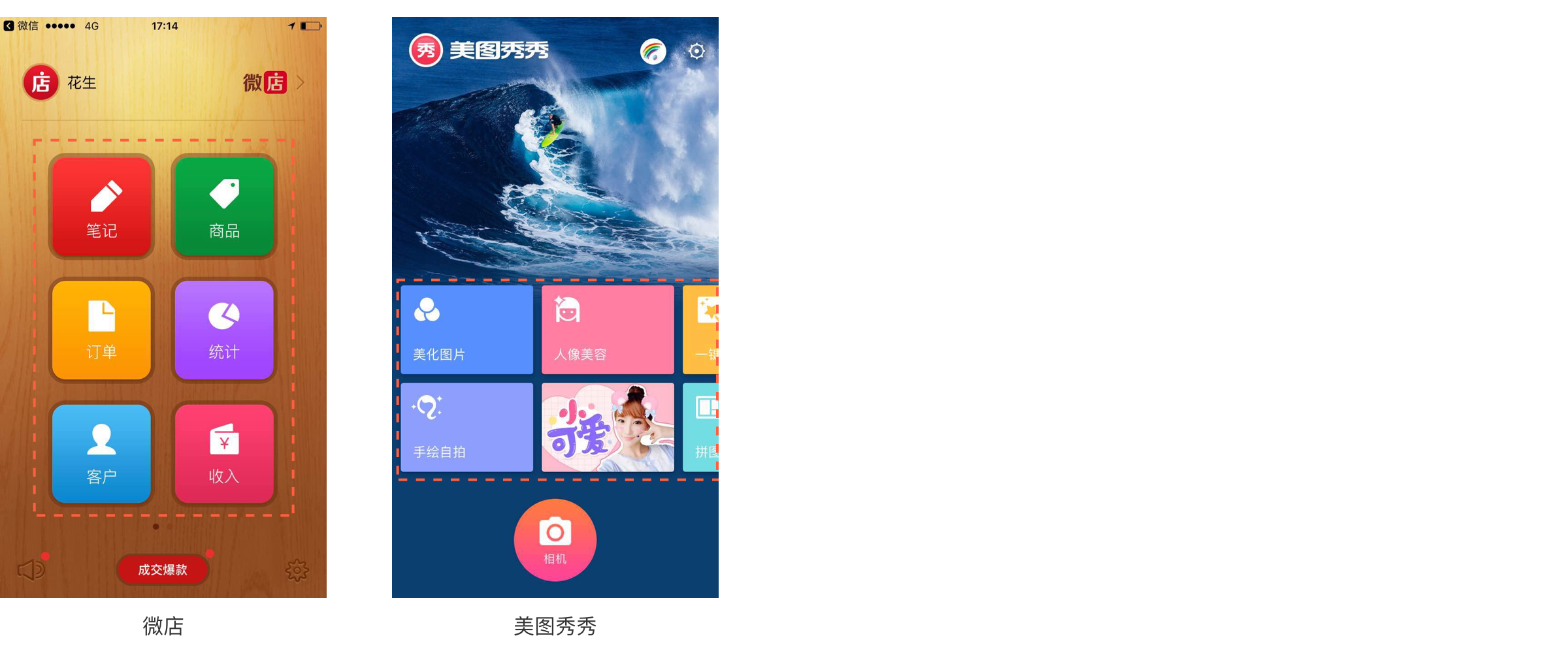 2.2如下圖所示,微店、美圖秀秀是為數(shù)不多的采用宮格式導航做為主導航的應用。