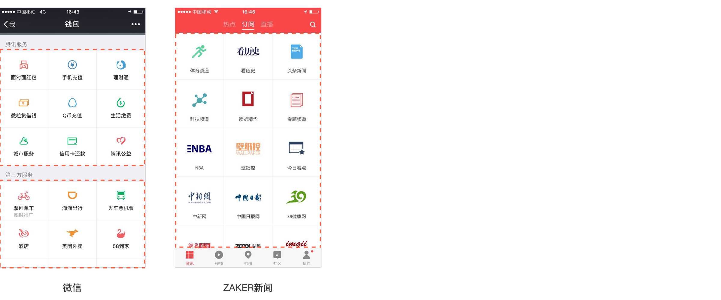 2.3當前,主要是利用宮格式導航的擴展功能來做次級導航,與標簽式導航以及其他類型的導航模式共同構成整個應用的導航系統(tǒng)。如下圖所示,微信錢包中的其他應用服務、ZAKER新聞中的頻道就是采用的宮格式做為次級導航。