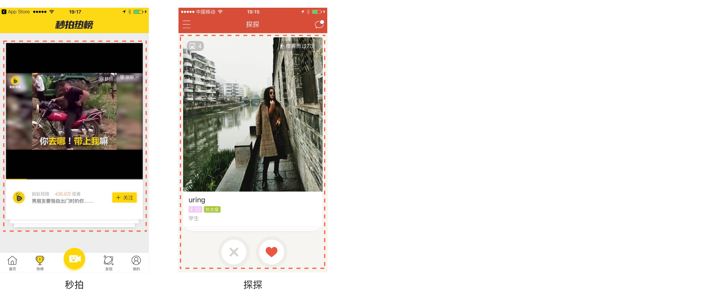 如下圖所示,秒拍的熱榜、探探都是采用了卡片式導航。