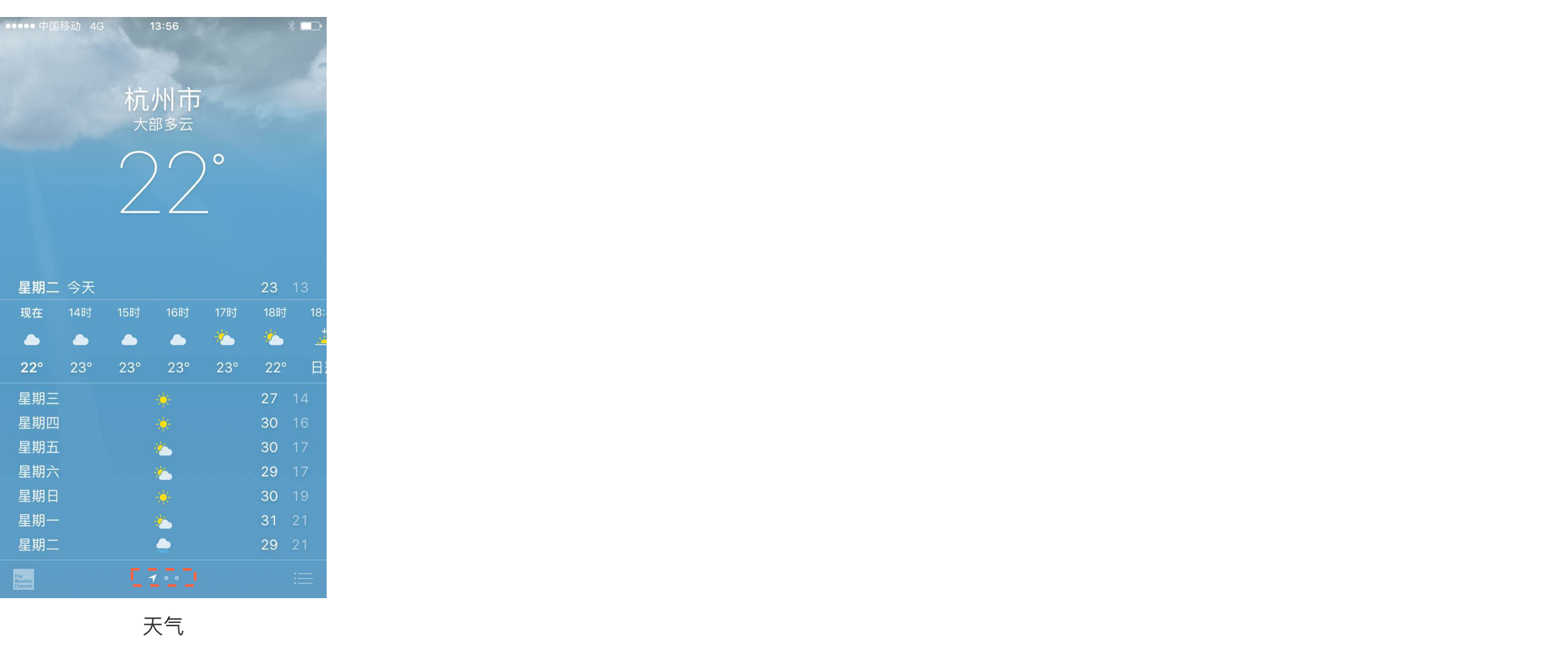 如下圖所示,天氣應用就使用了輪播導航,一個頁面展示當前城市的完整天氣情況,左右滑動切換察看其他城市的情況,十分方便