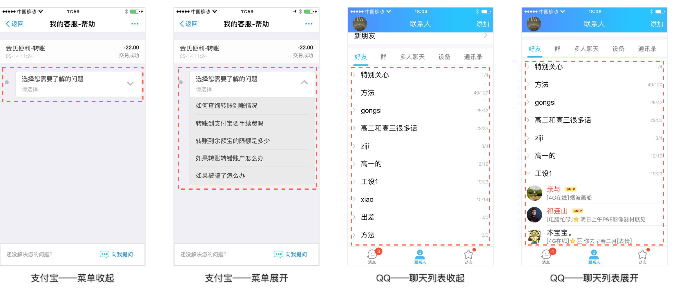 如下圖所示,支付寶的客服功能,QQ的好友列表都用到了折疊菜單。