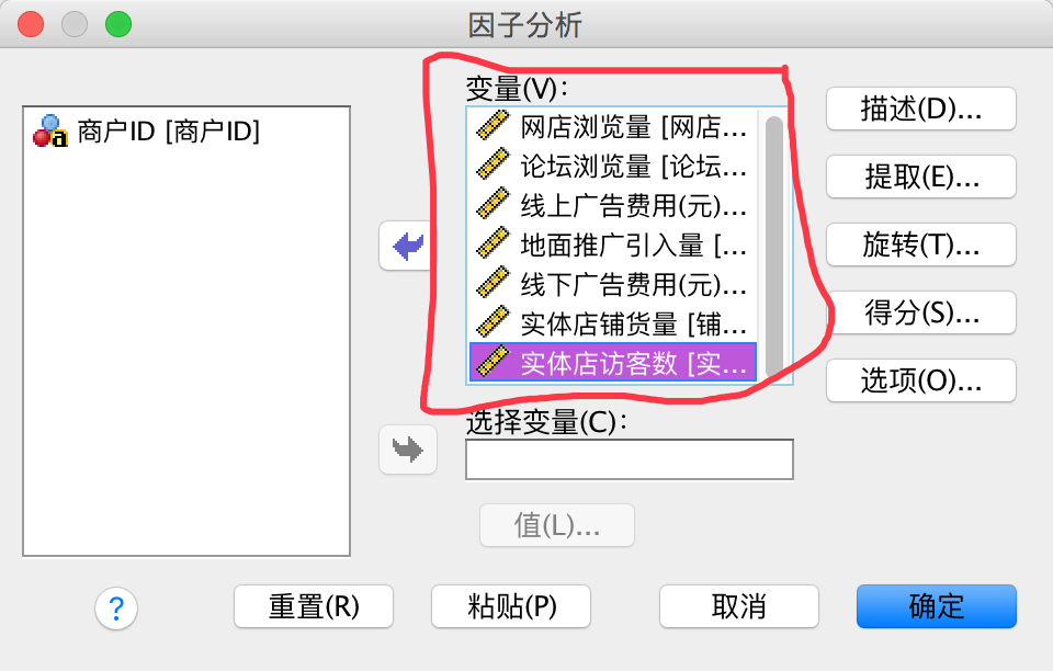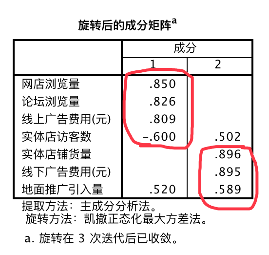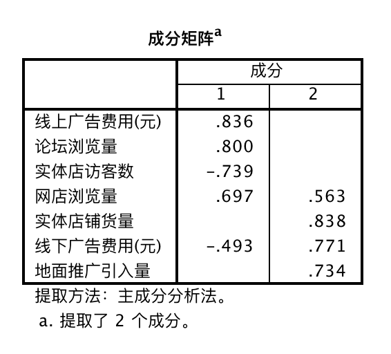 第一個因子:載荷較大的變量是“網店瀏覽量”、“論壇瀏覽量”、“線上廣告費用”、“實體店訪客數”,說明這四個變量與該因子的相關程度較高,其中前三個是反映的是線上數據,“實體店訪客數”放映的雖然是線下數據,但是與第一個因子呈現反向關系。綜上所述可以吧第一個因子命名為“線上商務”。