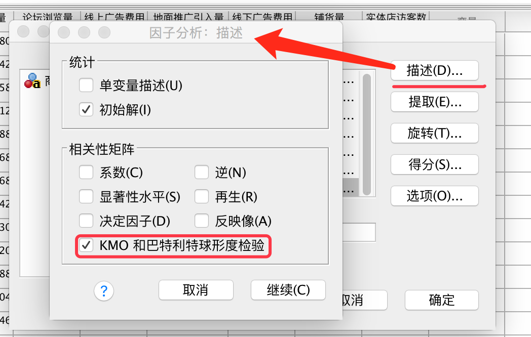 勾選“KOM和巴特利特球形度檢驗”,目的是用于生成檢驗因子分析適合度的統計指標。