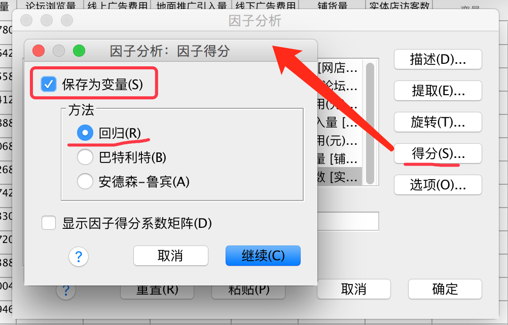 勾選“保存為變量”,方法選擇“回歸”,用于保存計算的到的因子得分。