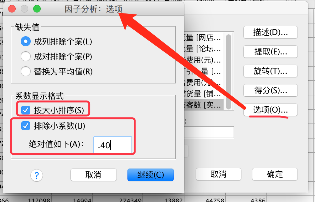 勾選系數顯示格式中的“按大小排序”,是為了讓系數大小有序,方便觀察;勾選“排除小系數”,輸入0.4,這樣在結果中相關系數小于0.4的會被排除,不再顯示,也是為了方便觀察(因為我們是尋找相關系數高的)