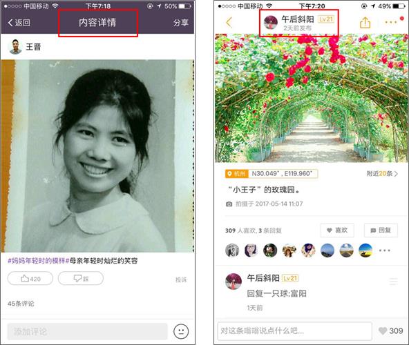 從此,它變為一個個性化推薦功能的快捷入口。當很多產品的底部tab都是靜止不變的時候,就需要思考,它能不能變化?能不能成為其他的東西?當易信曬一曬需要解決露出更多評論的問題時,我們發現了嗡嗡的設計,如下圖所示。我們早已被頂部bar的“刻板印象”束縛了,大多數都會顯示著頁面標題,有些可能會沒有頂部bar;而頂部bar其實可以像嗡嗡的“變化”一樣,它可以顯示更多:頭像,名字,等級,發布時間。