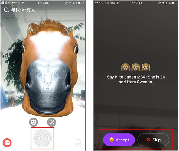 最近也在研究實時隨機視頻的產品,如tiki和monkey。我們的設計師發現同樣類型的產品,設計上卻完全不一樣,比如tiki是要主動去找人,而monkey是等別人找上門來,選擇接受或不接受,如下圖所示,這背后的根源是中西方人群的差異,還是兩種模式帶給用戶的心理感受的差異?