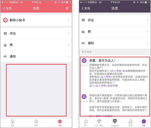 易信聊唄的“消息”就像很多產品的消息頁一樣,包含官方消息、評論、贊、通知;當時進行設計時,就這么做了;而易信曬一曬已經將官方消息露出,來占用空白區域進行導流,如下圖所示。