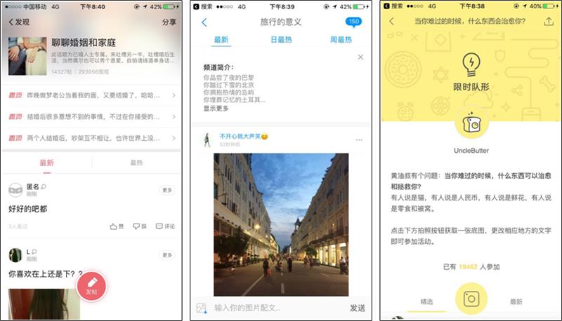 之前在做易信聊唄話題主頁的探索時,根據“刻板印象”,用最快的效率完成了方案,就像下圖所示的布局一樣,和貼吧等產品的興趣主頁很相像,也就沒那么獨特。但是,其實很多產品有更多的布局,比如same、黃油相機和in。方案可能是很多樣化的,根據最刻板的印象來設計的方案可能不會有太多問題,但也不夠創新,只有探索足夠多樣化的方案,才會在無形中打破“刻板印象”,形成新的經驗和印象。