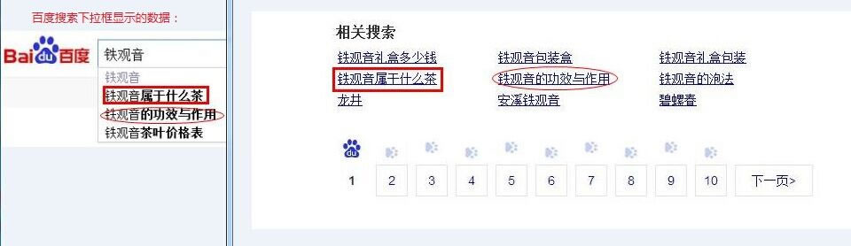 下拉框和相關搜索出現一致的關鍵詞有:鐵觀音的功效與作用 鐵觀音價格。