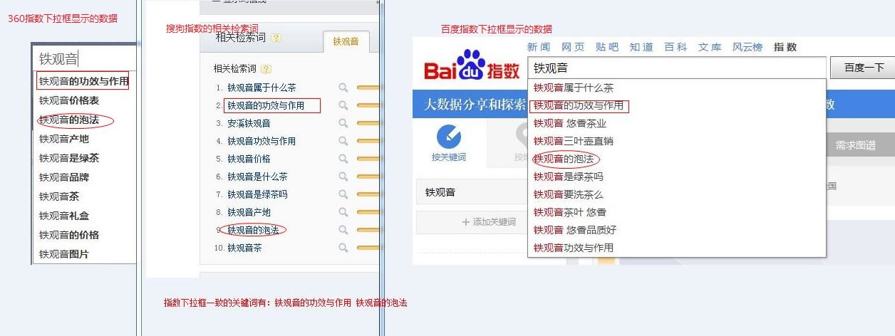 還是出現用戶關心的詞:鐵觀音沖泡、鐵觀音泡法、鐵觀音功效與作用、鐵觀音價格、鐵觀音屬于什么茶、綠茶三:百度、360、搜狗指數的相關檢索詞: