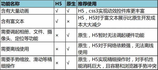 但仍然有些技術壁壘由于平臺性能等無法攻克,下表列出了H5和原生能實現的常見功能及推薦,在遇到面臨包括此種功能的需求時,可以直接據此判斷用何種技術來實現。