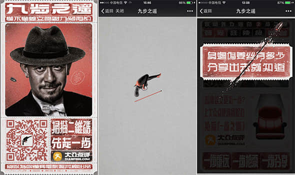 大眾點評姜文電影推廣系列的《九步之遙》H5專題頁便牢牢抓住了這一點。從二維碼入口到性感的loading頁,再到最后分享提示的設計,包括文案措辭和背景音效,無不與整體的戲虐風保持一致,給到用戶一個完整統一的互動體驗。
