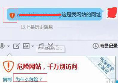 有時候在qq里面傳播的網站也會被提示為危險網址,如圖: