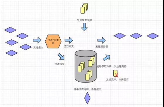 數(shù)據(jù)報(bào)到來(lái)時(shí)從桶中取令牌,如果桶中有令牌,憑借令牌處理請(qǐng)求,處理完畢令牌銷(xiāo)毀;數(shù)據(jù)報(bào)到來(lái)時(shí)發(fā)現(xiàn)桶中沒(méi)令牌,該請(qǐng)求將被拒絕。