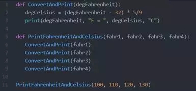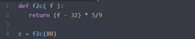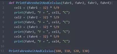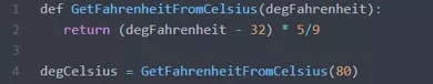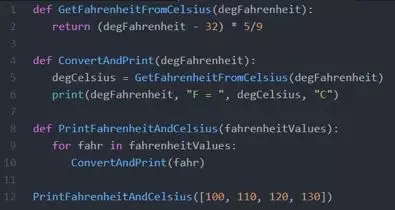 更清爽對吧!代碼看起來更干凈、更簡潔。而且,它比前一個示例更具描述性。那個公式只會在定義ConvertAndPrint函數時出現一次。如果只是想把華氏度轉換成攝氏度但是不顯示這些數據呢?可以通過定義不同的函數來實現: