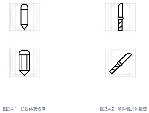 那么,以上的參考線應該怎么使用?我們畫圖標的時候,物體會有長有扁,有圓有方,在統一體量感的時候,就需要用到里面的一些參考線。但是記住,參考線是死的,人眼是活的,畫完以后,要靠感覺微調,直至視覺上體量感達到一致。請看下圖2.2.3分析: