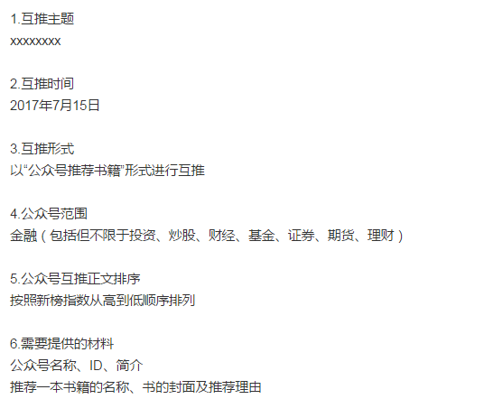 所以我們為了節省時間精力以及大程度吸引公眾號的小編的注意,可以直接編輯一個模板,里面包含互推主題,互推時間,互推公眾號的范圍、互推形式等等。最好還可以留下你的微信號,或者直接叫對方如果愿意參與直接留下來微信,你直接加他微信詳聊。這樣就能大大地提高效率。