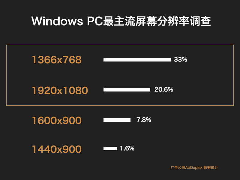 (來(lái)自:廣告公司AdDuplex 大數(shù)據(jù)顯示(最主流的PC屏幕分辨率依然是1366×768,而Win10系統(tǒng)下依然有近34%的設(shè)備保持這個(gè)分辨率,只有27%以上的PC在全高清或者更高級(jí)別)http://diy.pconline.com.cn/886/8861940.html)