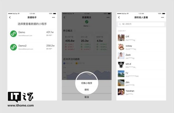 只要進入“小程序數據助手”,就可以方便地查詢到你綁定的小程序的用戶數據概況、訪問分析和實時統計等數據,授權完畢,老板、同事或者其他有需求的微信用戶都可以使用。