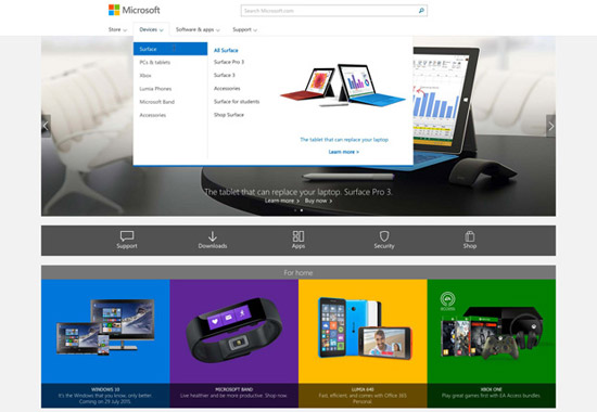 以微軟的首頁為例,網(wǎng)站的導(dǎo)航欄被劃分成四個(gè)項(xiàng)目,考慮到微軟龐大的產(chǎn)品線,這幾乎已經(jīng)被簡化到了極致。也正是因此,每個(gè)項(xiàng)目的下拉菜單都被巧妙地分割成為幾段,這樣一來,導(dǎo)航的層級就清晰了,用戶可以更快地找到他們想要的東西,而微軟也可以將復(fù)雜多樣的產(chǎn)品和服務(wù),整合到一個(gè)看似簡單的導(dǎo)航欄里面。