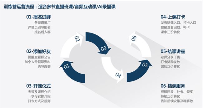 下圖是低價訓練營模式的運營流程,因為筆者曾多次發文拆解過,就不再這里贅述。其實你能明顯發現,低價訓練營的轉化本質就是優質內容和社群運營,內容的作用不必多說,主要依靠主講老師的表現,除此之外就是根據社群活躍情況設計轉化節奏。