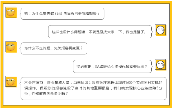 變更的大致流程是:需求確認 -> 干系業務/人確定 -> 方案探討 -> 方案確立&時間確立 -> 變更單撰寫 -> 變更單 review -> 審批報備 -> 變更通告 -> 方案實施 -> 方案效果反饋 (-> 回滾方案),可酌情進行步驟刪減。遵循變更流程的主要好處是,首先,你可以在整理變更步驟的時候仔細思考每一處風險點,多次變更之后可以固化下來風險相對較小的標準化文檔,后續可以把重復操作自動化。其次,風險均攤及最小化,方案是大家探討后確定的,時間是大家商量后認可的,流程是經過審批報備的。真的,如果把類似的流程貫徹下去,因為變更產生故障的概率會大大降低?,F在成熟的公司運維團隊,都已經把類似的流程固化到運維平臺里了,但是又有多少團隊的負責人真正在遵循,而不是隨便審批了事呢?不要和我談業務壓力有多大,不要和我談缺人手,原則是不能卻步的,否則撿了芝麻丟了西瓜。