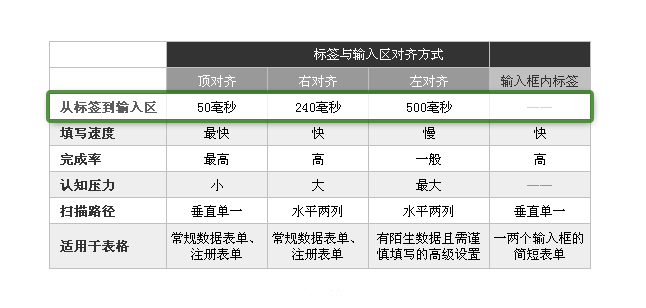 對齊方式是最重要的問題。選擇左對齊、右對齊還是頂對齊?這是表單設計中經常遇到的問題。前人的研究發現了這樣的規律:就觀看時間、填寫速度來說,頂對齊快于右對齊快于左對齊。