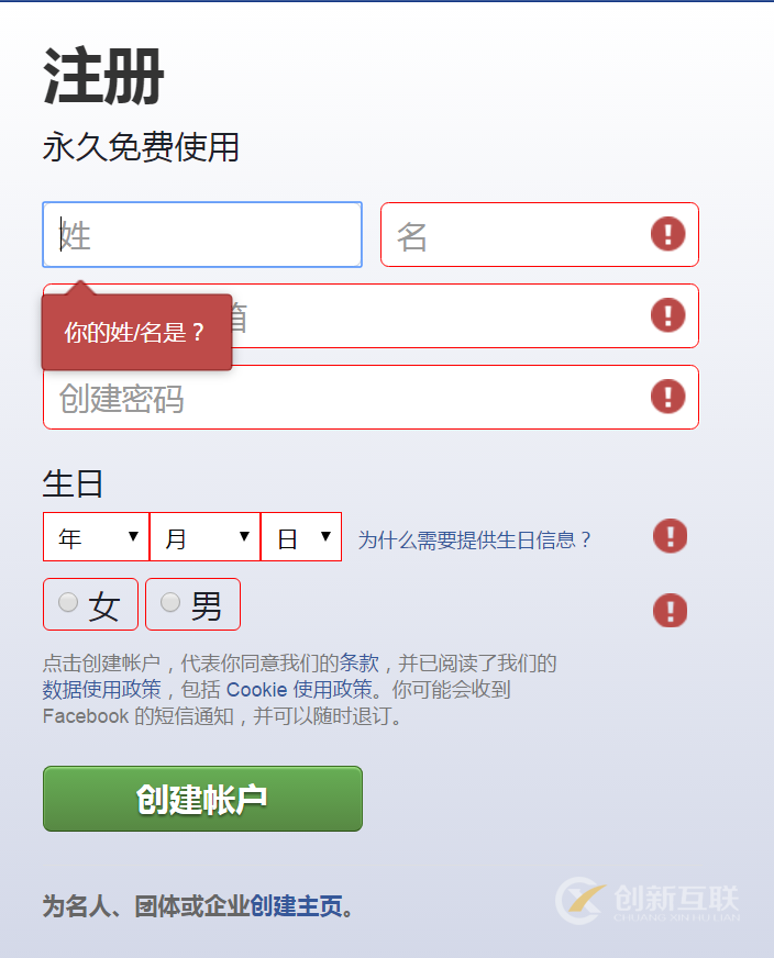 但是下面facebook注冊頁的反饋看起來就有點鬧心了,剛點擊“姓”輸入框準備填寫,后面其他還沒填寫的輸入框都默認為填錯了。設置錯誤反饋需要注意這樣的問題,反饋應當是在每一項填寫完畢時出現。