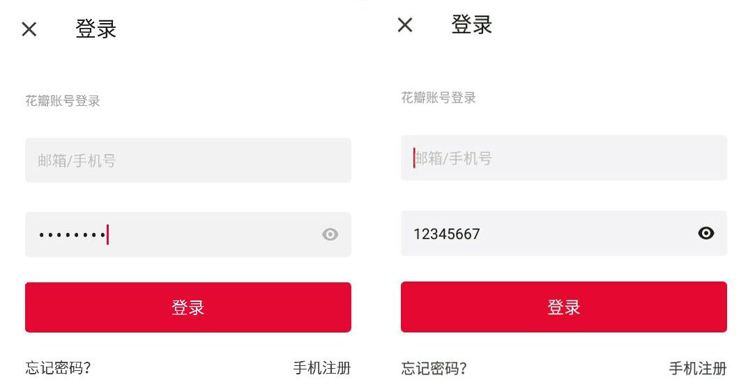 上圖密碼在填寫過程中只顯示正在輸入的那一位,輸入下一位時自動隱藏,這是一種比較好的方式,既能夠看到自己填的密碼,又不用擔心他人窺視。