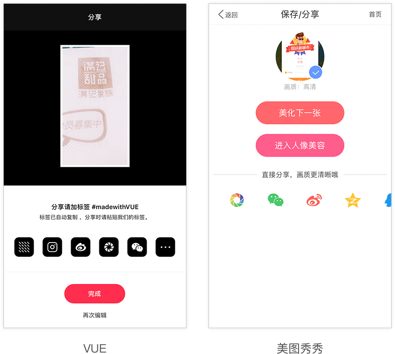 工具類APP則是在得到結果的時候提示分享,比如使用拍照和攝像類的軟件,得到處理完成后的圖片和視頻時,往往需要提示用戶進行分享。