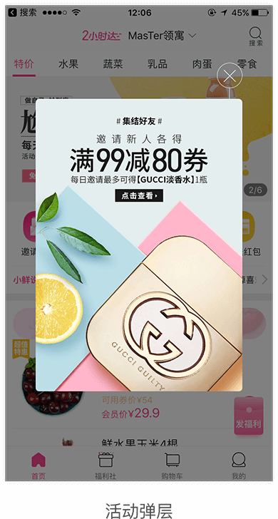 在有大型的拉新活動或節日活動時,打開APP會直接有彈層鼓勵用戶通過分享來得到紅包或其它優惠。