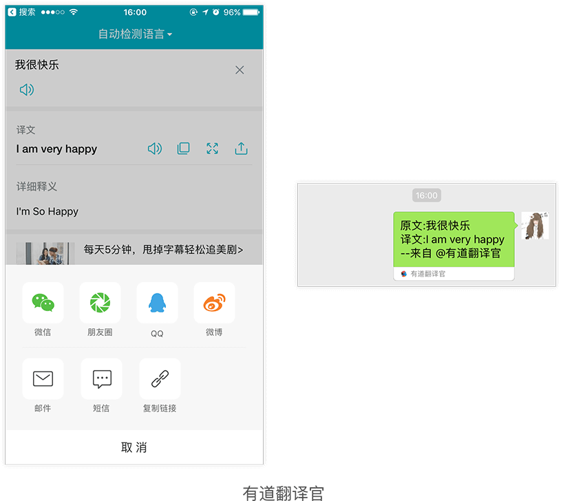 最直觀和簡單的類型,適用于簡潔的文本內容分享。比如有道翻譯官的翻譯結果分享。