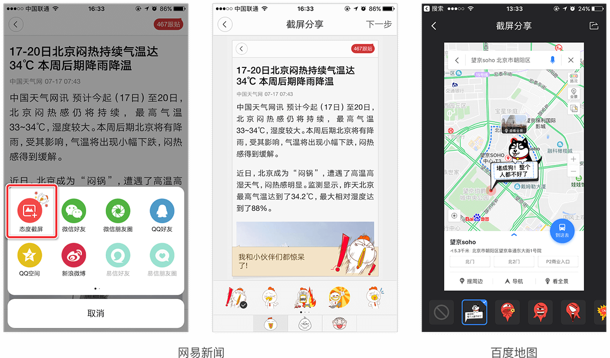 而在一些APP中,產品設計者希望用戶能夠在分享內容時帶上自己的態度和情感,所以除了自動生成圖片外,還提供給用戶多種自定義編輯的方式。比如很多資訊類APP都可以在分享時給圖片加上態度印章,在百度地圖分享圖片時可以加上「堵成狗」的形象表情;微信讀書在分享書中內容可以對書簽進行樣式編輯,提供給了用戶更進一步的分享體驗。