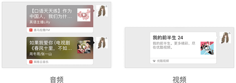 這一形式的分享從用戶的分享操作和體驗上來講沒有什么特別之處,但分享出來的內容會標記它是音頻或是視頻,讓接收信息的用戶更快了解其內容特性,并且在一些平臺上音視頻內容可以直接在當前頁播放,無需點擊進入。比如得到APP,喜馬拉雅FM和網易云音樂分享給微信好友的是可以直接點擊播放的音頻。
