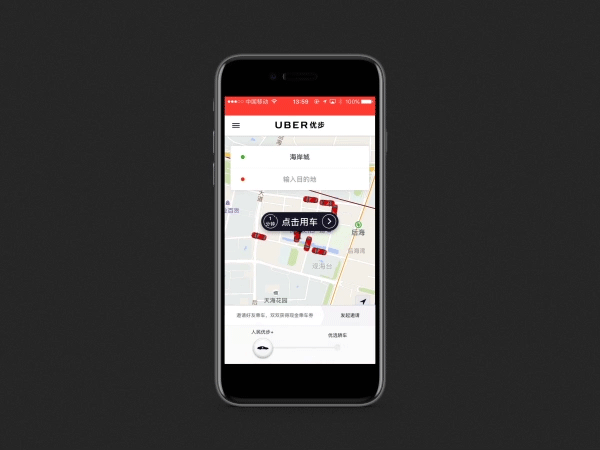 Uber給主召喚按鈕添加了柔和的旋轉(zhuǎn)動(dòng)畫,輕易就把用戶的注意力吸引過去。一句話總結(jié):會(huì)動(dòng)的元素永遠(yuǎn)能優(yōu)先引起用戶的注意,考慮其特殊性,會(huì)動(dòng)的元素只能是一個(gè)。