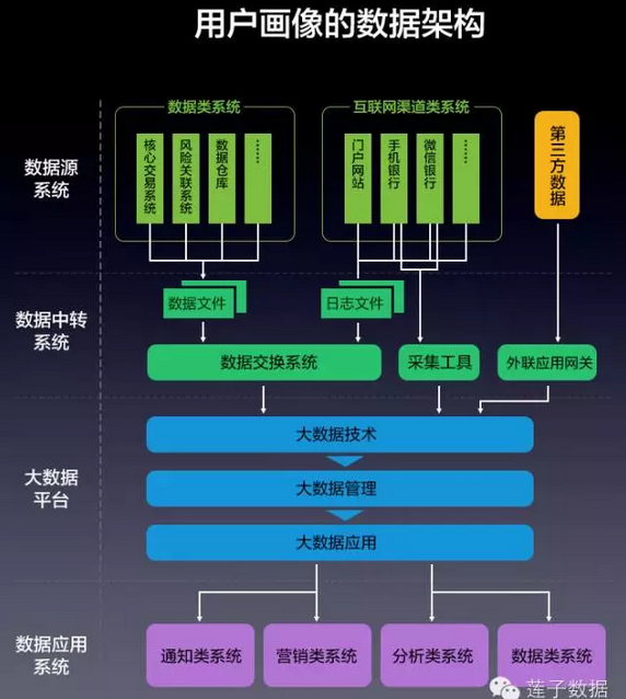 為了精準(zhǔn)地描述用戶特征,可以參考下面的思路,從用戶微觀畫像的建立→用戶畫像的標(biāo)簽建?!脩舢嬒竦臄?shù)據(jù)架構(gòu),我們由微觀到宏觀,逐層分析。