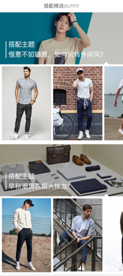 下半部分Banner采用了176*176PX(1:1)的小圖。這樣圖片比例符合之前分析的專題圖適合16:9,商品圖適合用1:1。這樣的大小比例看起來可以讓版塊之前區分的很清楚。當然如果下半部分圖片一定要使用小圖,否則看起來層次就混亂,。例如男衣邦的首頁,上圖和下圖的比例看起來非常的接近。模塊層次區分的就不是非常好。