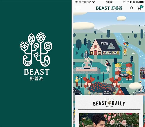 野獸派是綜合類的時尚類家居相關售賣平臺。野獸派本來是一個買花起家的應用,她賣的不是花,而是花一般的美好的生活理念。隨著越做越大,品類也擴張到各種家居、美妝、香氛、配飾和美食等。這里比較吸引人的是野獸派的首頁交互設計。使用一個整張插畫,作為首頁各種子模塊店鋪的入口。這樣的設計別具一格,的確第一眼非常的吸引人。