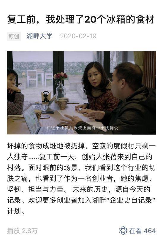 湖畔大學學員之一、杭州十里芳菲度假村的創(chuàng)始人張蓓在“企業(yè)歷史記錄”拍攝的視頻中講述道,作為一家民宿品牌的創(chuàng)始人,如何在復工前,“處理了20個冰箱的食材”,讓人看到了民宿行業(yè)的切膚之痛。