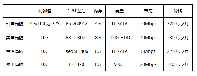 高硬防月付服務(wù)器價(jià)格多少?不同機(jī)房,不同帶寬和配置,不同的防御值,費(fèi)用差異很大。總的來(lái)說(shuō),目前國(guó)內(nèi)使用最多高硬防月付服務(wù)器包括韓國(guó)、美國(guó)、中國(guó)佛山高防服務(wù)器,還有最近崛起的香港高防服務(wù)器。其中,佛山高防因?yàn)樵趪?guó)內(nèi),機(jī)房成本較低,因此價(jià)格最便宜,分為單線和雙線,但需要備案;其次為帶寬資源豐富的美國(guó)高防,缺陷是國(guó)內(nèi)訪問速度慢;最后是香港和韓國(guó)高防,價(jià)格適中,免備案,香港因?yàn)榫嚯x大陸近,香港服務(wù)器速度更快。以下是幾款各地基礎(chǔ)配置的高硬防月付服務(wù)器價(jià)格,供大家參考。