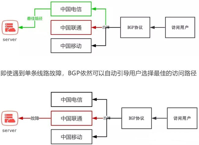 在這里需要特別說明下,真正的BGP路由協議分智能和手動方式2種。真正的動態BGP和IDC市場上的BGP多線(三線/四線/五線)帶寬是不一樣的,區別不在于實現多線接入的問題,而是普通BGP多線并不具備真BGP動態最佳路徑自動切換的功能 ,當靜態BGP當某條鏈路或單點路徑出現故障的時候,它所在的AS中形成路由黑洞,該AS內的用戶將出現無法訪問情況,需要人為介入進行手動修復且修復時間較長。真正的動態BGP路徑是自動切換的,不會因某個節點故障造成區域內用戶無法訪問。