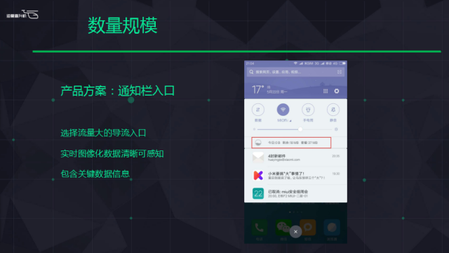 我就把它放在通知欄里,通知欄每天收到5條10條是有的,每天你會打開看一下,我們盡量做的小一點,我們做了處理之后左邊加上一個動態圖標,會根據你的消耗漲和減,這樣我覺得從產品體驗上盡可能做到不打擾用戶。但是我們在一個用戶高頻使用的入口上面強加了一個應用,我們占了這個入口,肯定有一部分的用戶很反感,我又不需要你,我每個月10個G流量呢,你在這給我開一個賣流量的入口,把這個地方看成一個商店,覺得很打擾他。那我們怎么做呢?