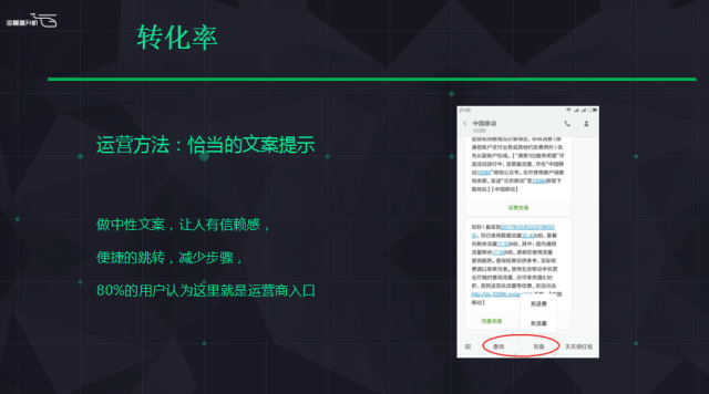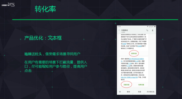 再說轉化率問題。我認為剛才說到如果我對一萬個人去推薦,和一百個人去推薦是不一樣的。另外一個問題是說如果同樣對一萬人推薦,我肯定希望最好是10%,不是1%。我們就分析這個項目的用戶人群,我們覺得買流量充值加油包的人肯定是缺流量的人,我們就分析缺流量的人在哪里?缺流量的人平常意識里面也不主動意識自己缺流量。實際上80%意識到自己缺流量時是運營商給他發的短信,基本上運營商發短信每個月收到3到5次,當你使用到50%、80%、90%時都會收到運營商的推送,會告訴你流量還剩多少。我們當時就想,收到短信后用戶怎么辦?他肯定想我去買一個流量補充下。或者是算了,我把流量關了這個月不用了。如果去買流量的話,過去是去線下的充值點,或者是找支付寶或者微信支付打開從錢包里去買。這樣他還是需要兩到三步的操作體驗,我們想要做的是當他意識到缺流量,找一個點充值的環境把這部分人攔下來提供我們的服務,這樣就在你收到的短信上面收到一個文本框,這個文本框每條短信收到后出現四個字流量充值,只要用戶一點就可以進行充值成功,這樣少兩到三個步驟。
