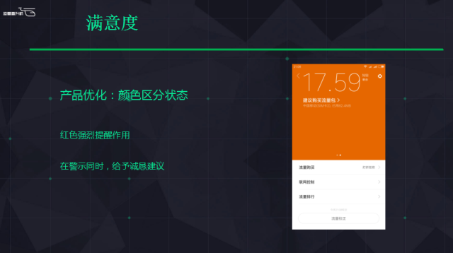 在這里你看今日流量剩余多少?還沒有出流量的入口,等到這個字的時候出了四個字購買流量。我們平時給你提供的是數據監控的服務,幫你監控手機流量,大家知道每個月有套餐來用,但不能隨機知道流量用了多少。所以我們給他提供一個功能,先把服務做好,幫你提供了一個實時查看流量的功能,這樣用戶覺得挺好的,幫我提供掌管流量的能力,放在通知欄里面。這樣提供之后,用戶覺得挺好,小于5%的關閉,基本不會關閉,給他起到提示的作用。因為做了這個服務在流量不夠的時候,會彈到流量已達到多少的提示,這個提示出來時購買流量四個字才會出來。這樣用戶只有需要時,才會打擾他。去推薦給他。這個服務運營工作做了一些很相關的后臺工作,為了達到準確率,因為這個東西如果放在那里,你的數據是不對的。如果用戶說我用了30%,就告訴我已經用了90%,你錯誤的給我一個提示,這個時候用戶很反感,相當于反而變成打擾他的東西。所以我們在運營后端加了很多的人力,對短信的精準度和監控數據分析邏輯做好,做到真正幫用戶提供準確的服務。